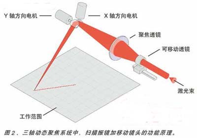 一套基本的x-y掃描裝置看起來很簡單:兩塊反射鏡,由電機驅(qū)動,可將入射激光束反射到特定區(qū)域(工作區(qū)域)的任何點。一組平場(f-?)透鏡確保焦點在工作區(qū)域平面內(nèi)(二軸系統(tǒng),如圖1),對基本的Nd:YAG激光器來說,典型的工作范圍為40×40平方毫米(ff-?=100?毫米)至180×180?平方毫米(ff-?=254?毫米;對于高級諧波激光器和二極管激光器,其工作范圍為40×40?平方毫米(ff-?=100?毫米)至120×120平方毫米(ff-?=163?毫米),具體取決于平場透鏡的焦距。顯然,所需工作范圍越大,工作距離越長。如果在掃描振鏡前端的激光光路中,使用聚焦透鏡和可移動透鏡的組合來代替平場透鏡,工作范圍和工作距離還會進一步增加(三軸系統(tǒng),如圖2)。該裝置可使工作范圍達到1200×1200平方毫米,工作距離達到1500毫米。