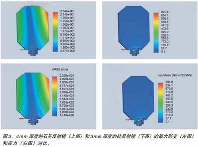 以硅為基底,可以減小反射鏡厚度(重量),同時形變、應力和較厚的石英基底反射鏡相同(見圖3)然而,由于該反射鏡系統(tǒng)重量,應力和形變?nèi)匀惠^大。硅基底仿真圖表明慣量和重量都降低15%,頻率幾乎保持不變。