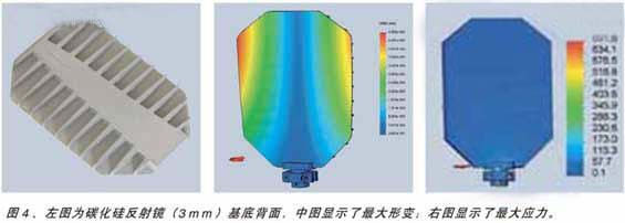 石英的一大缺點是它的熱導率很低,這導致它的冷卻性能很差。硅基材料,比如硅或碳化硅,可提供較高的熱導率。由于碳硅基材料強度更高,因此允許減小其厚度,盡管其密度較高,仍可減輕總體質(zhì)量。如果使用不透明基底,如Si或SiC,寬波段反射鍍鋁層可直接鍍在鍍電介質(zhì)膜和硅基材料之間介電層上。對反射鏡基底機械設(shè)計進行仔細的模型計算,可在穩(wěn)定性、重量、導熱性和轉(zhuǎn)動慣量方面獲得最優(yōu)化的設(shè)計。