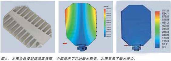 另外,基于模型計算優(yōu)化后的參數(shù)可確保最優(yōu)設(shè)計。由于較低密度和相對重量較高的楊氏模量值,鈹模型相對碳化硅模型的設(shè)計更為簡便。該材料的另一優(yōu)點是其吸附能力。對比碳化硅和鈹反射鏡,鈹模型比碳化硅少兩個臨界頻率。這將為伺服電路板和振鏡電機提供更為簡便的自動控制能力。結(jié)果是鈹反射鏡相對碳化硅反射鏡,重量減少35%,慣量減少35%。反射鏡設(shè)計,最大形變和最大應力如圖5所示。