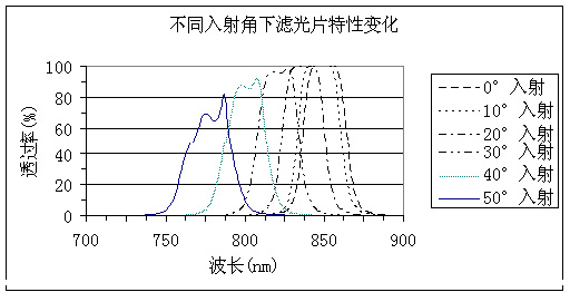 假如入射光線與濾光片的法線夾角有一定規(guī)模,那么要指明這個(gè)夾角的詳細(xì)規(guī)模,因?yàn)楦缮鏋V光片的規(guī)劃對(duì)視點(diǎn)十分敏感,關(guān)于0°下規(guī)劃的窄帶濾光片,假如在不同視點(diǎn)下運(yùn)用,其作用是完全不同的。圖3是以850nm窄帶濾光片為例,當(dāng)入射視點(diǎn)增大時(shí),中心波長的方位不斷向短波移動(dòng)。只要是干涉濾光片,這個(gè)視點(diǎn)效應(yīng)無法避免,這是干涉濾光片的根本特性。從圖中可以看出,當(dāng)一個(gè)850nm的窄帶濾光片在50°下運(yùn)用時(shí),它不再是一個(gè)850nm的窄帶濾光片,而變成了770nm的窄帶濾光片。有些用戶會(huì)反映,在用廣角鏡頭拍照物體時(shí),加了窄帶濾光片后,發(fā)現(xiàn)只能拍到中心部分的物體,邊上的都很暗,認(rèn)為窄帶濾光片只有中心透,邊緣不透,這種認(rèn)識(shí)是不對(duì)的,窄帶濾光片整個(gè)表面都是均勻的,主要還是因?yàn)榇笠朁c(diǎn)入射時(shí),濾光片的透光波段向短波移了,而短波部分又沒有光源造成的。